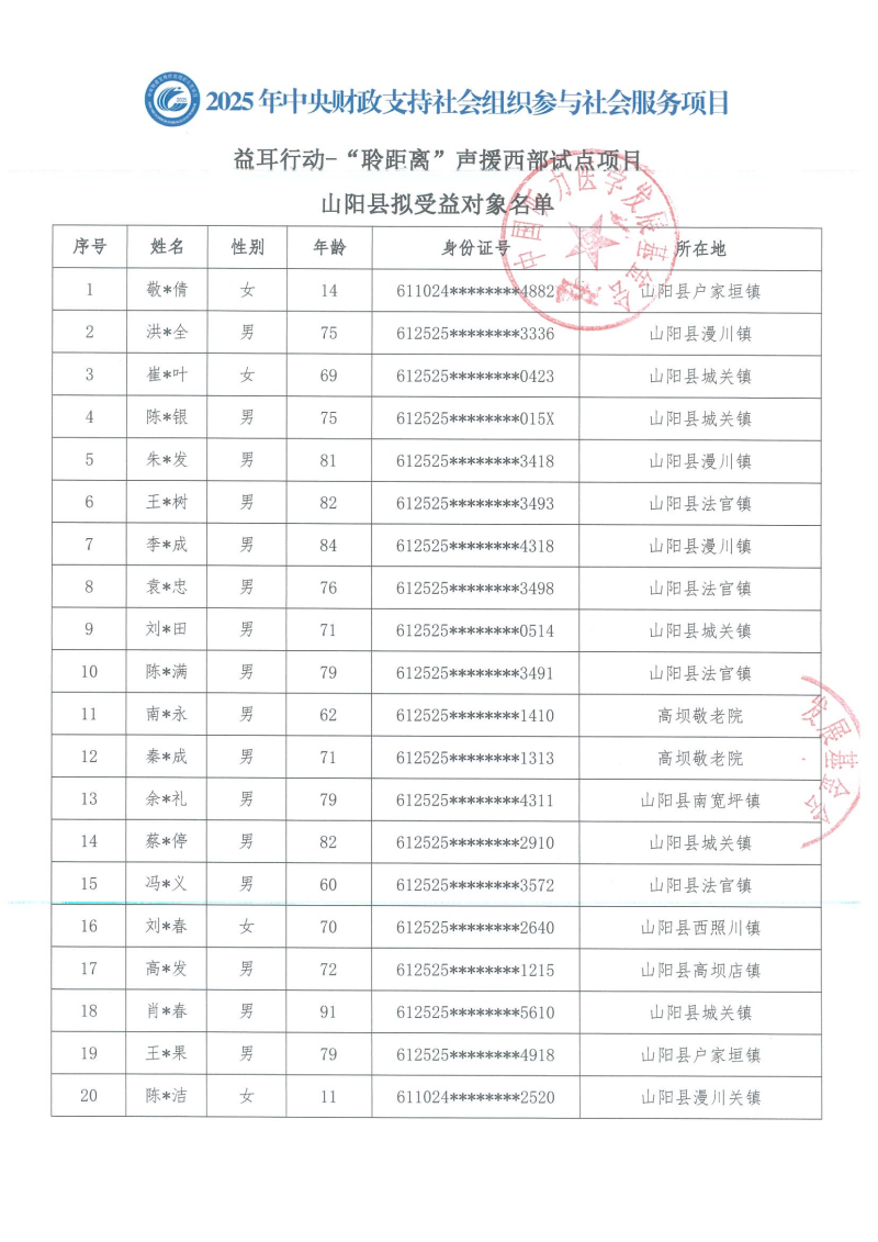 益耳行动-“聆距离”声援西部试点项目山阳县拟受益对象名单公示