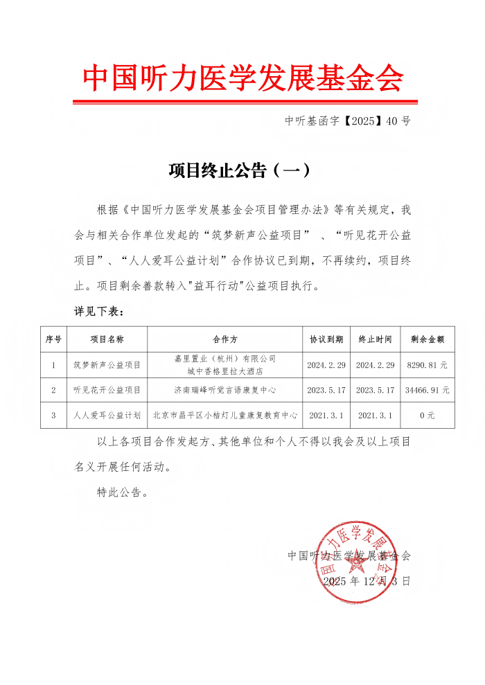 中国听力医学发展基金会 项目终止公告(一)