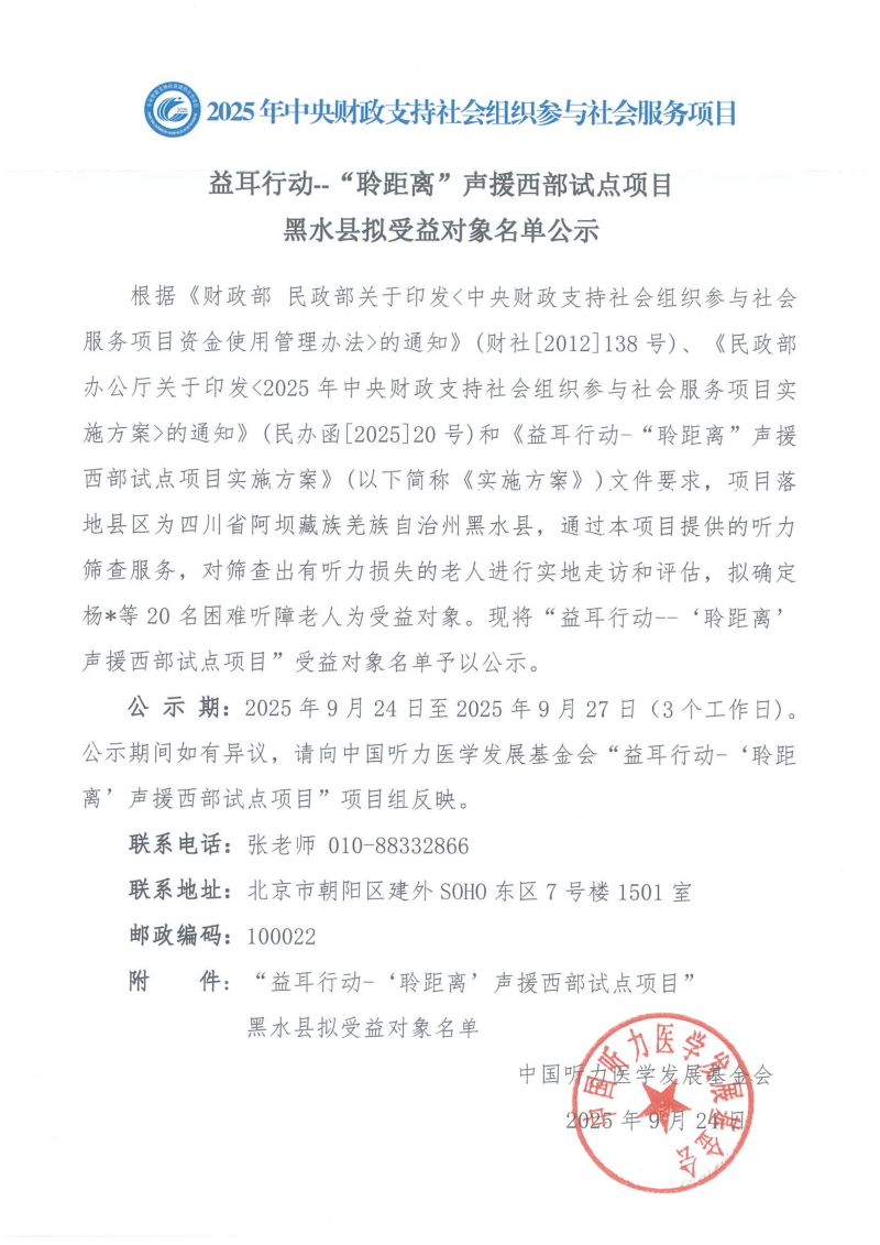 益耳行动-“聆距离”声援西部试点项目黑水县拟受益对象名单公示