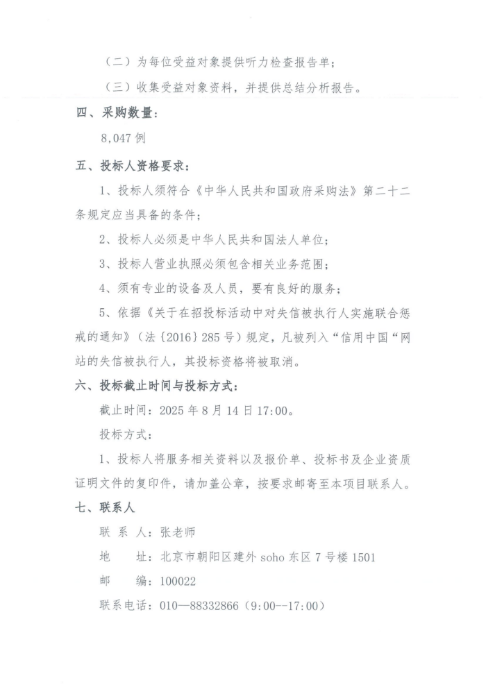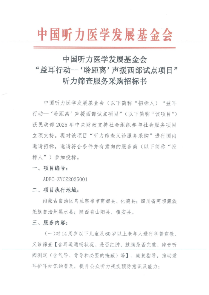 “益耳行动--‘聆距离’声援西部试点项目”听力筛查服务采购招标书