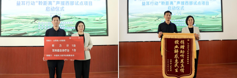 中国听力医学发展基金会向山阳县民政局、山阳县人民医院递交捐赠牌,并接受锦旗。