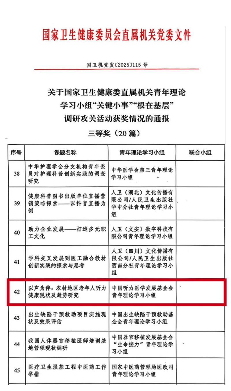 2025年10月30日,国家卫生健康委员会直属机关党委发布获奖通报,中国听力医学发展基金会青年理论学习小组《以声为伴:农村地区老年人听力健康现状及趋势研究》荣获2025年国家卫生健康委直属机关青年理论学习小组“关键小事”“根在基层”优秀调研报告三等奖。