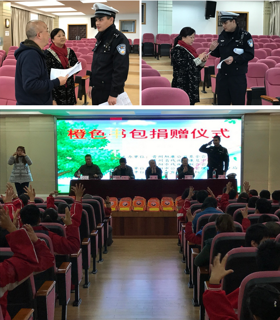 受邀参加捐赠仪式的贵阳市云岩区交警大队“最美交警队队长”周龙队长,呼吁全社会,尤其是交通参与者,关注橙色书包,关爱听障儿童。