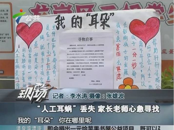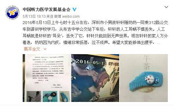 2016年5月13日上午七时,深圳听障男孩小轩轩随奶奶乘公交到语训学校学习,从布吉中学公交站下车后,不慎将昂贵的人工耳蜗外机遗失。