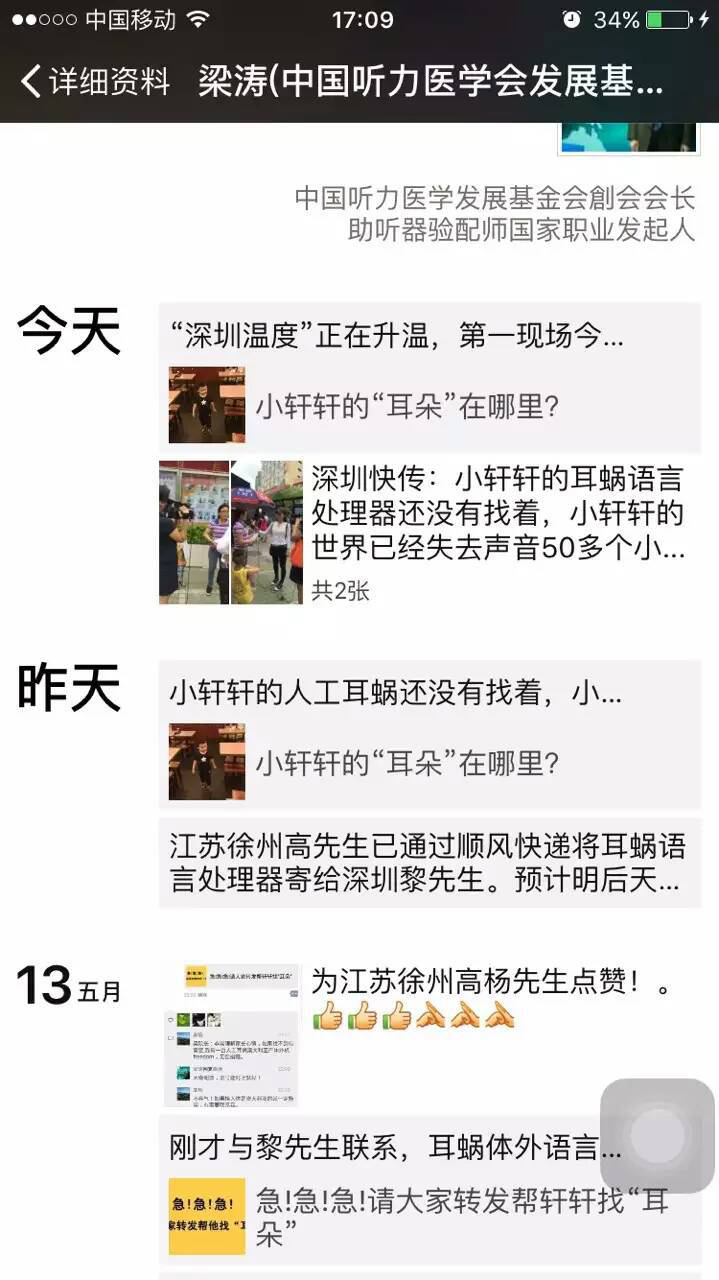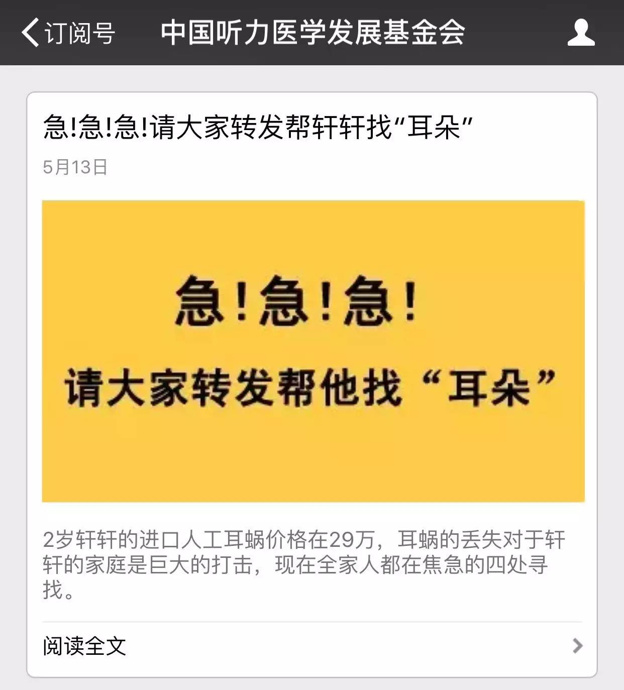 中国听力医学发展基金会闻听小轩轩丢失人工耳蜗外机后,第一时间与小轩轩父母取得联系,并迅速反应,在基金会官方微信公众平台、官方微博进行“寻耳”的消息推送。