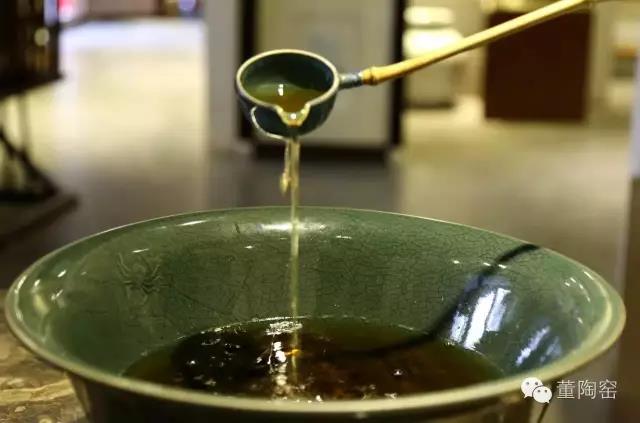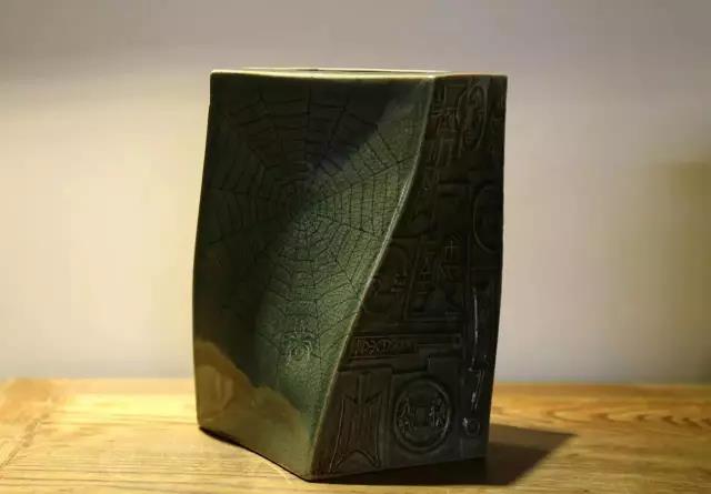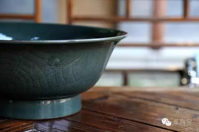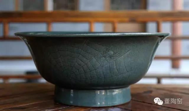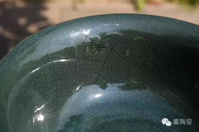 畅谈中,董宁先生起身从身后的多宝阁中取出一件器物让我们观赏。初一见我还是楞了一下,貌似一个大海碗却又不像,于是便问其谓何名?“此器为盏,尚未取名”董先生似有所思的答道。“好大的盏呀!”我不禁一笑。再仔细一看,不禁慨叹董先生的文化创意,青釉大盏形成的龟裂给人一种古朴雅致之美,好似美玉琢磨而成,做工十分细腻考究。而真正吸引我的是盏中那纵横的丝网与盏口的一只蜘蛛。蛛网很浅很浅,浅到不经意则难以发现,倒是那只蜘蛛,虽在静静守候,却能让人一眼便认出来。我似乎明了董先生的用意,小心地擎在手中细看,果然在盏外侧还有一张浅浅的蛛网在萦绕着,呼应的是那么自然、贴切。