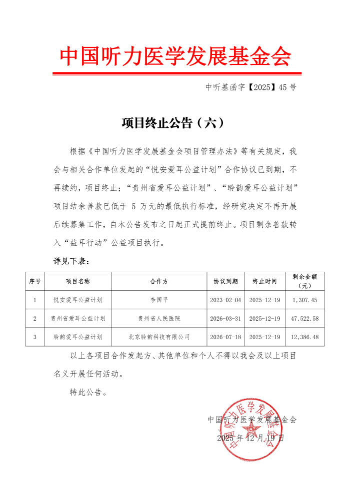 中国听力医学发展基金会 项目终止公告(六)