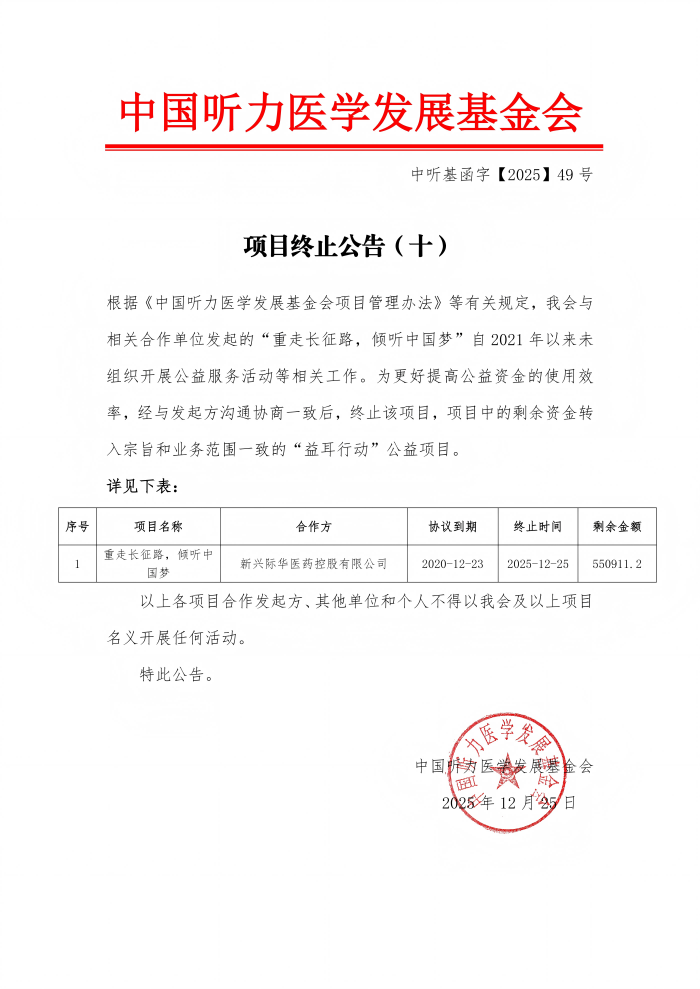 中国听力医学发展基金会 项目终止公告(十)