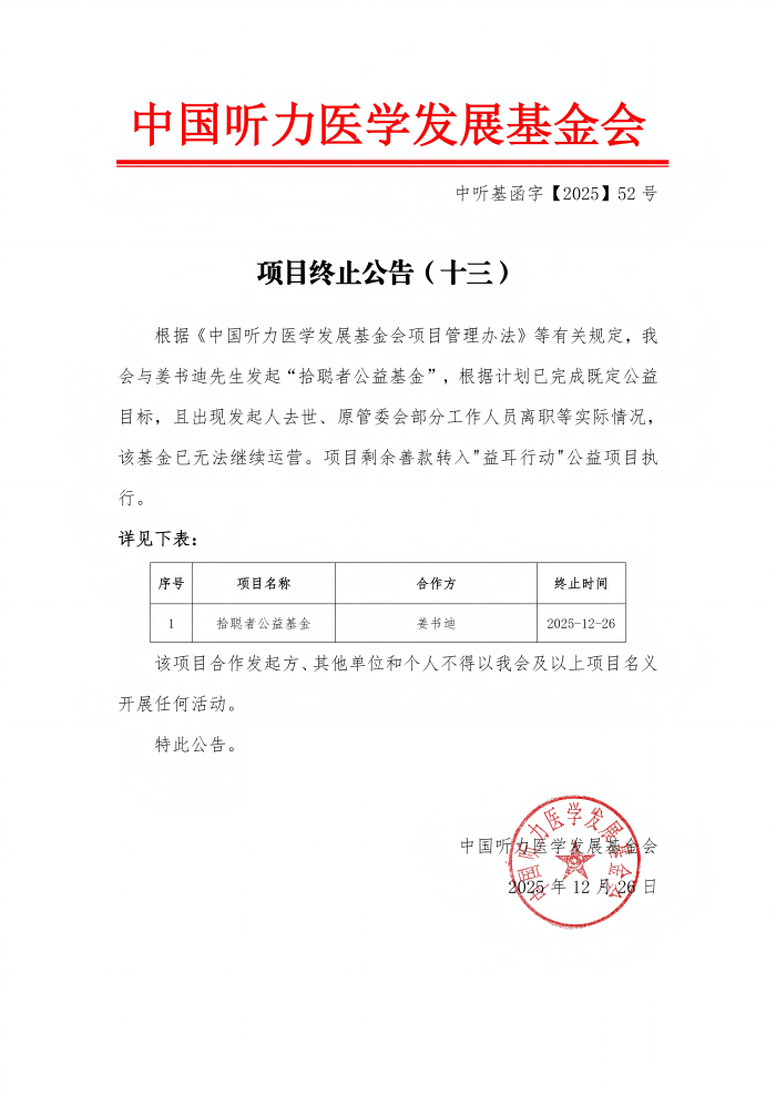 中国听力医学发展基金会 项目终止公告(十三)
