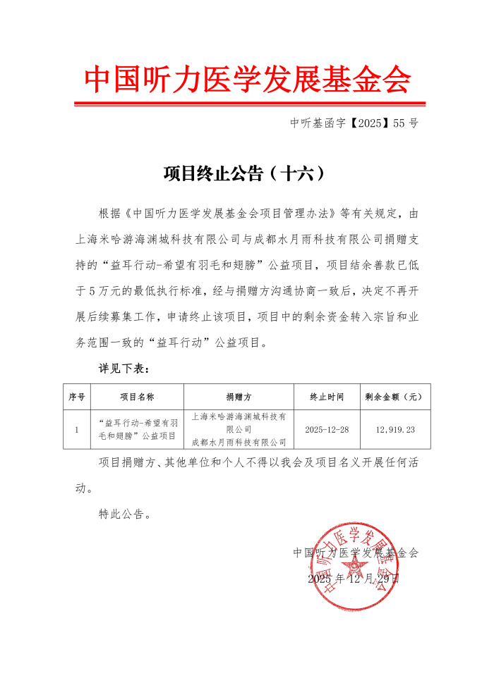 中国听力医学发展基金会 项目终止公告(十六)