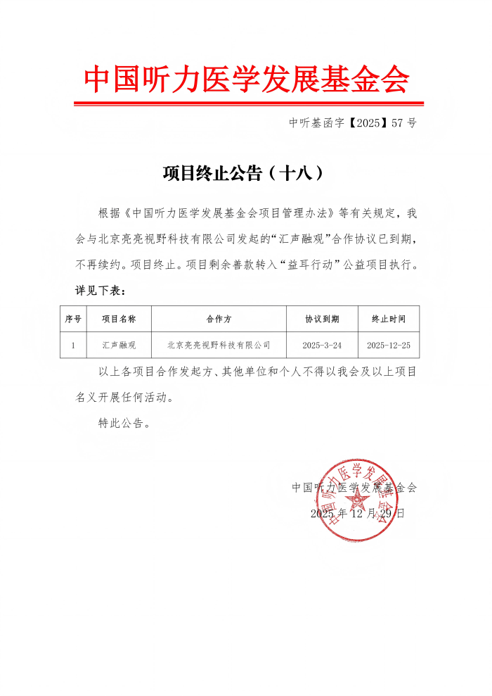 中国听力医学发展基金会 项目终止公告(十八)
