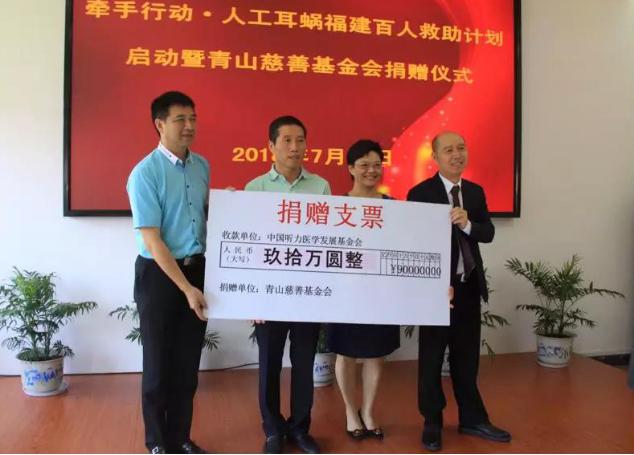 青山慈善基金会首期向我会“牵手行动·人工耳蜗福建百人救助计划”捐助90万元善款,用于帮助10个听障儿童植入人工耳蜗。