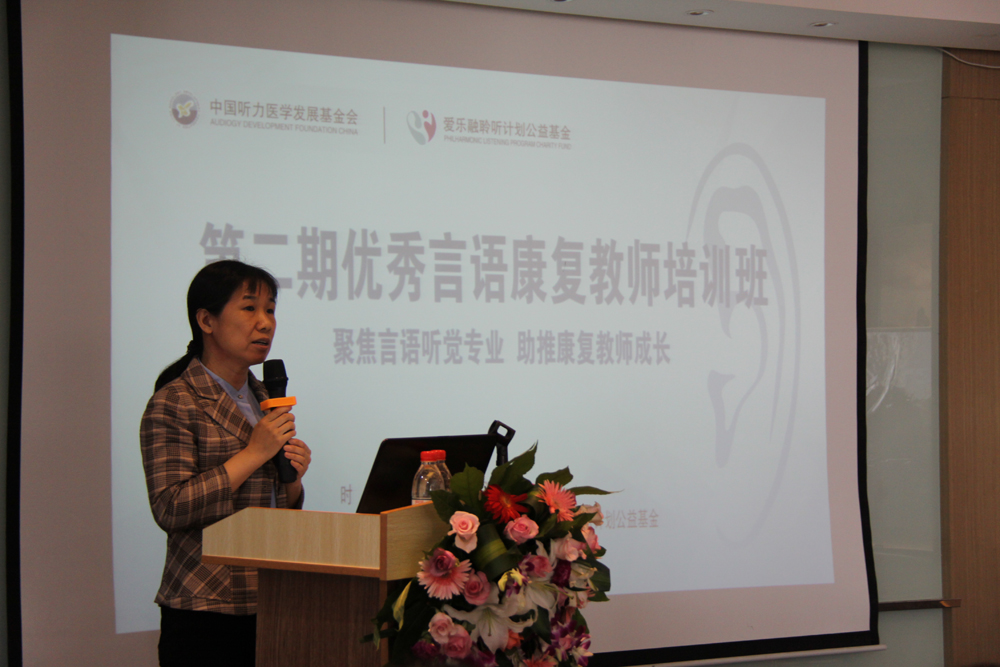 我会理事、爱乐融聆听计划发起人王丽娟、中国听力语言康复研究中心语训部主任卢晓月等出席了开班仪式。王丽娟理事在开班致辞中指出,本次培训是爱乐融聆听计划首次在国内开展的大规模、系统化的康复教师培训,希望这次培训能够让更多康复教师在康复技能和康复理念上有所突破,更好地为听障儿童提供服务,爱乐融聆听计划也将继续开展言语康复教师的培训活动,并将下一期的培训地点定在海外,以期让老师们学习到更多国外先进康复理念和技术。卢晓月主任表达了对爱乐融聆听计划工作成果的肯定,希望各康复老师在学习中进步,在交流中提升,进一步加强和改进听障儿童康复工作。