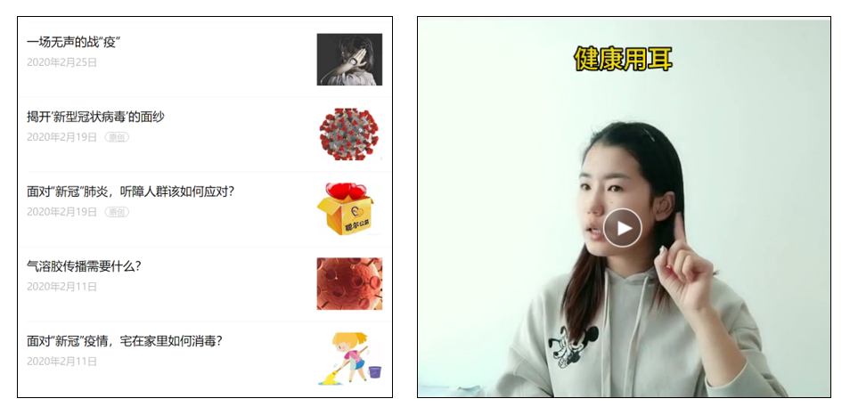 针对疫情,志愿者们从各种渠道得知,很多听障人士在疫情当中生活和心理都面临着挑战,因为沟通不畅出现了信息获取不及时,资讯落后、心理紧张等问题,志愿者们通过组织专业人士编写《听障人群应对指南》《宅在家中如何消毒》《揭开新冠病毒的面纱》等文章,及时让听障人士了解疫情发展状况,如何科学防控疫情和面对疫情时听障人士心理辅导,取得了不错的效果,受到了听障群体的一致好评。