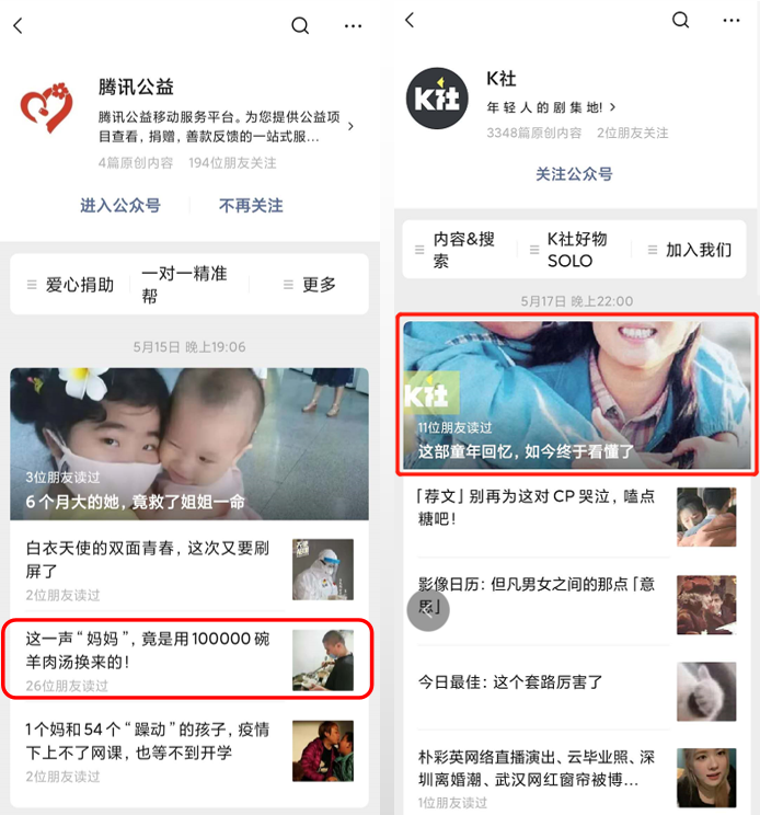 5月15日,我会爱乐融聆听计划助残日主题文章《这一声“妈妈”,竟是用100000碗羊肉汤换来的!》获腾讯公益公众号推送。5月17日,知名公号“K社”结合电影《漂亮妈妈》,讲述了听障人群面临的困境,推出《这部童年回忆,如今终于看懂了》主题文章,呼吁社会各界支持爱乐融聆听计划,关注听障儿童,帮助他们回归有声世界。两篇文章在社会各界引起强烈反响,阅读量突破100000+,10000余人参与捐赠支持。