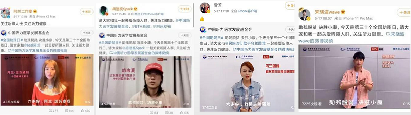 5月17日,我会通过微博、抖音、快手、今日头条等平台,发起“关注听力健康”线上公益倡导活动,本次活动得到了众多明星艺人、主持人及公众的参与支持。爱心大使阿兰、乌兰图雅、胡浩亮、宋晓波、蕾欧娜、姜馨田、刘小源、张涛等积极参与到活动中,一起为爱发声。