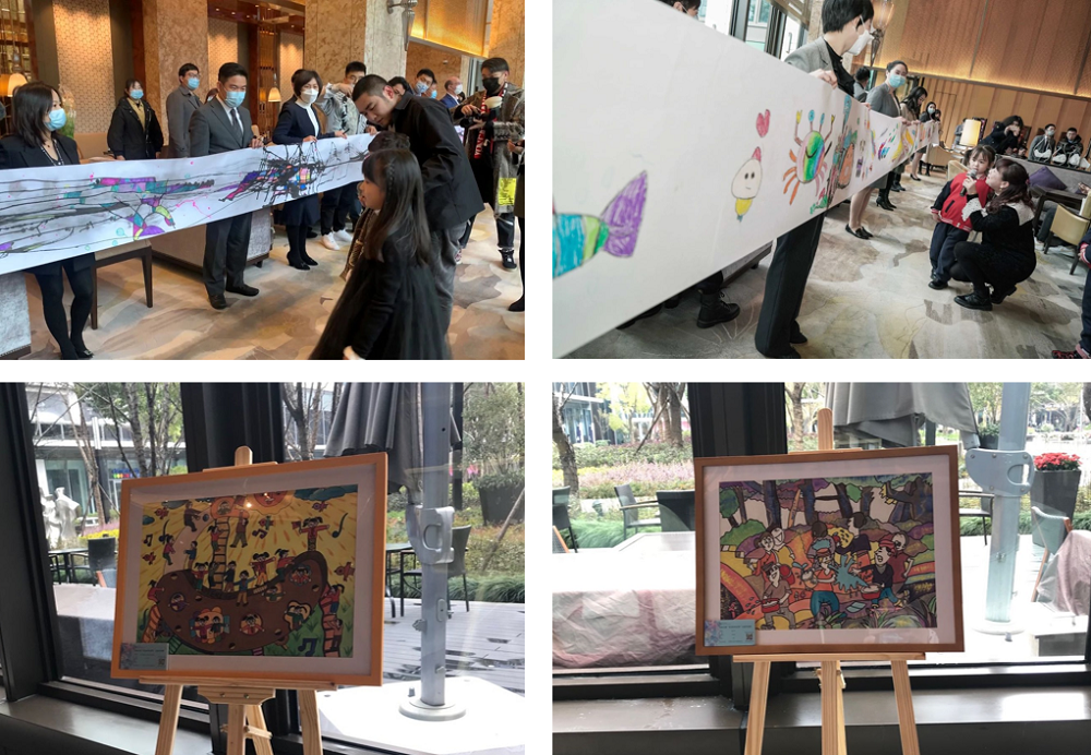 我会副秘书长甄丽霞、杭州城中香格里拉大酒店总经理Andreas Streiber(史利博先生)、中国美术学院出版社青少年美术教育研究中心主任周翔飞、浙江诺尔康神经电子科技股份有限公司总经理李楚、杭州市余杭区阳光语训中心的老师和孩子们以及社会各界的爱心人士出席了此次公益活动。