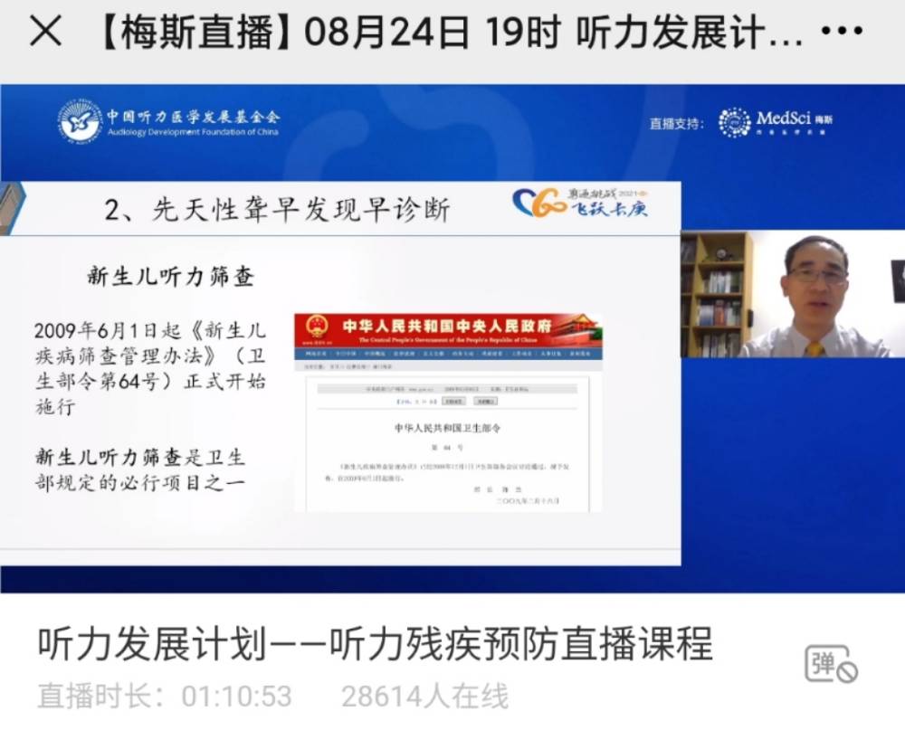 2021-08-25来源:听基会2021年8月25日是我国第五个全国残疾预防日,我会紧密围绕预防日主题“加强残疾预防,促进全民健康”,为让更多的耳鼻喉科医生能对听力残疾预防的概念及内涵有更深入的了解,“听力发展计划”系列云课堂于2021年8月24日晚19:00开启了直播课程。课程邀请到我会耳聋基因诊断与防控专家委员会主任委员、解放军总医院(301医院)耳鼻咽喉头颈外科主任医师、博士生导师袁永一教授和厦门长庚医院常务副院长、人工耳蜗中心主任卓明英教授直播授课。两位专家分别从《遗传性聋的发病、预防、干预》和《先天性聋的早期发现、干预及康复》两个议题切入,帮助从事听力医学的医护人员、关注听力残疾的社会公众、以及新婚夫妇、孕产妇、婴幼儿家长、听障群体等重点人群认识、了解相关的听力残疾预防知识,学习尽早发现、尽早干预的方法。直播课程由我会执行副秘书长甄丽霞主持,2万8千多听力医护人员、康复人员及网友参与直播课程。