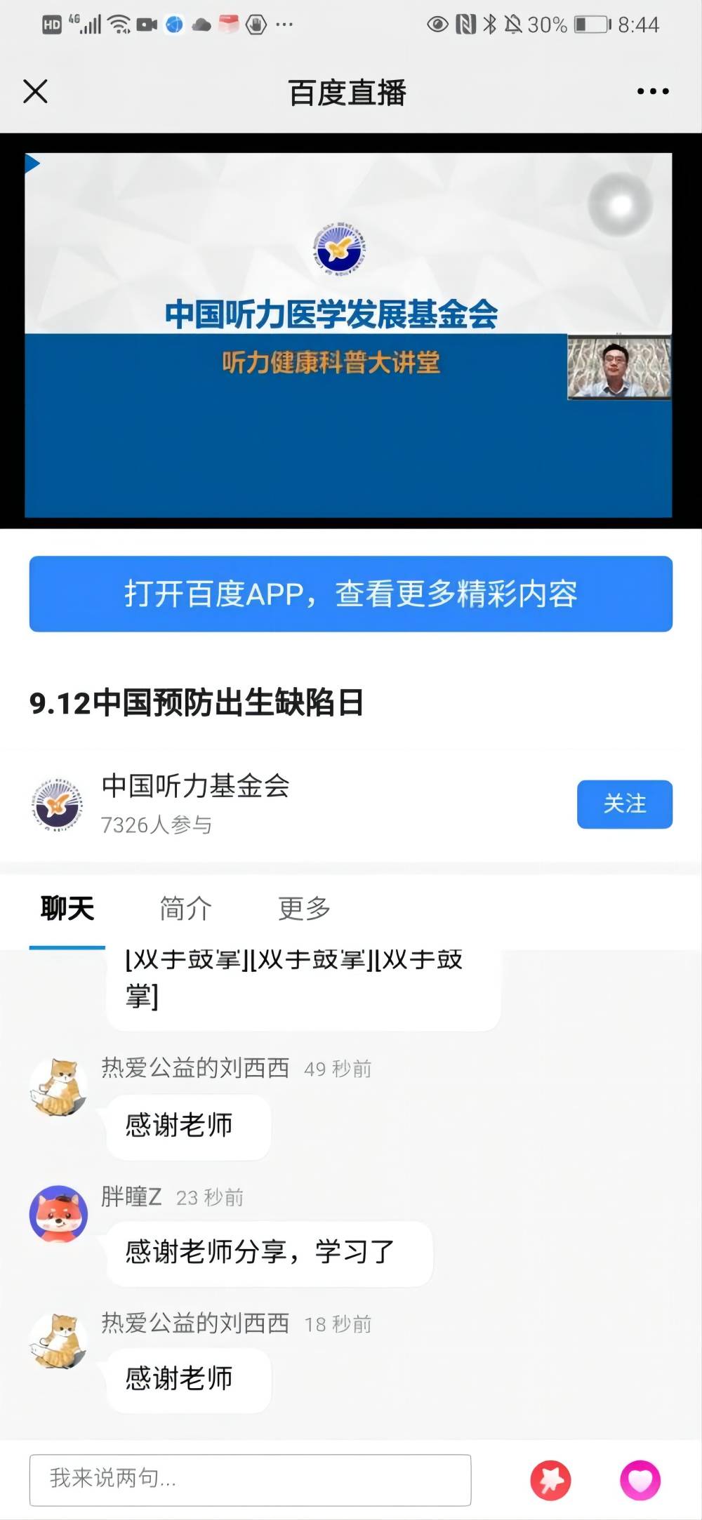 为加强预防出生听力缺陷,时值9月12日中国预防出生缺陷日,“听力发展计划”系列云课堂于9月12日19:00-21:00,我会联合百度健康、百度公益开展《中国预防出生缺陷日主题直播课程》,本次课程特别邀请到中国人民解放军总医院耳鼻咽喉头颈外科医学部学术委员会主任戴朴教授、青岛大学附属妇女儿童医院耳鼻喉科主任刘玉欣教授主讲。他们分别从《遗传性聋的机理、预防、人工生殖干预》和《小儿非遗传性听力损失的预防》两个主题进行分享,为医生、康复教师、社会公众等讲授耳聋预防、诊断、治疗等方面的专业知识。本次直播课程由我会专家指导委员会秘书长、中国人民解放军总医院耳鼻咽喉头颈外科医学部研究员郗昕教授主持,在线7300多听力医护人员、康复人员及网友参与直播课程,课程重点在2018年、2019年、2020年、2021年青岛市妇女儿童医院出生缺陷防治人才培训学员群、2021年青岛市出生缺陷综合防治培训群、青岛出生缺陷技能培训班群、青岛大学附属妇女儿童医院的耳鼻喉科工作群以及青岛妇儿医院数字化图书馆等工作群中做了课程推介,微信群中的医护人员认真听课,积极分享学习内容。