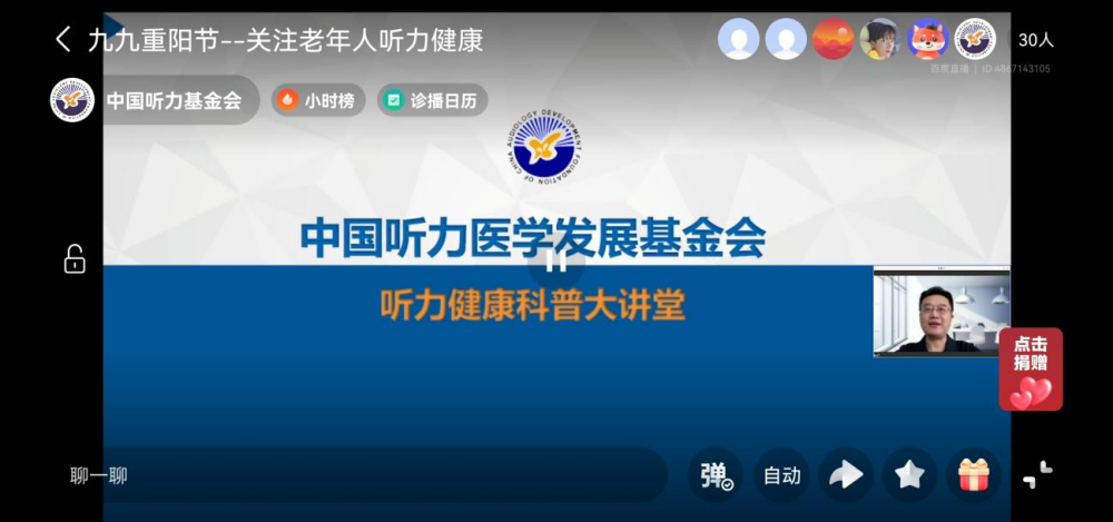 为倡导社会公众关注老年人听力健康,提高老年人的爱耳护耳意识,2021年重阳节来临之际,我会以“老年性听力减退的机制、危害、干预、康复及家庭支持”为主题,于10月13日下午14:00-16:00,邀请知名耳科专家开展了直播科普讲座。
