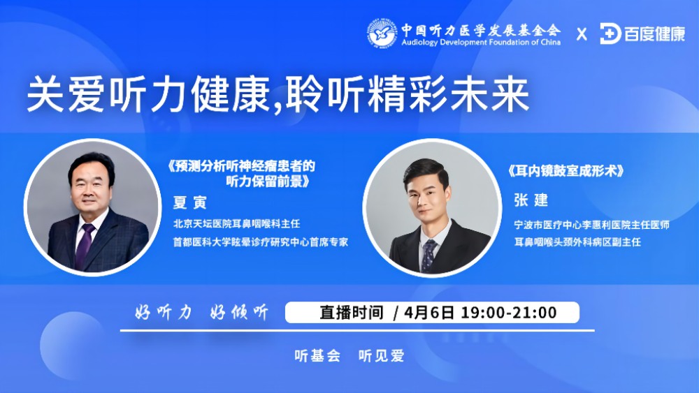 “听力发展计划-让爱同享有声世界”已开展了九场次活动,以耳科及听力学领域的培训和学术交流为主要内容,推动听力医学发展。2022年4月6日,第九期“听力发展计划”直播课程特别邀请了北京天坛医院耳鼻咽喉科主任、首都医科大学眩晕诊疗研究中心首席专家夏寅、宁波市医疗中心李惠利医院主任医师、耳鼻咽喉头颈外科病区副主任张建主讲,两位专家分别从《听神经瘤治疗策略与听力保留》及《耳内镜鼓室成形术》两个主题进行分享。本次直播活动由我会执行副秘书长甄丽霞主持。