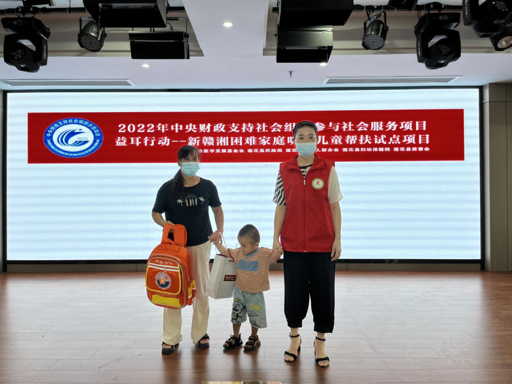 8月16日,由我会承接的2022年中央财政支持社会组织参与社会服务项目益耳行动-新赣湘困难家庭听障儿童帮扶试点项目捐赠仪式在莲花县妇幼保健院成功举办。莲花县民政局、莲花县慈善会、莲花县妇幼保健院、莲花县残联相关人员,以及听障儿童与其家长参加活动。捐赠活动由莲花县妇幼保健院儿童保健科主任刘金兰主持。