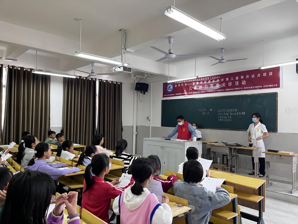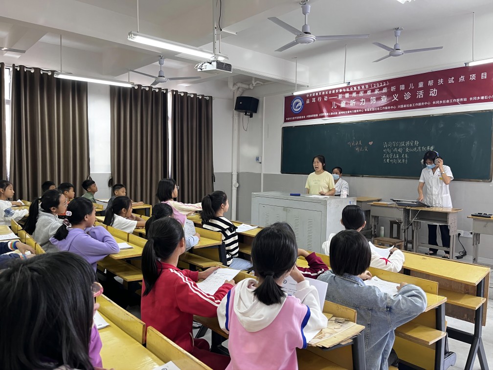2022年10月25日,在兴国县民政局的大力支持下,我会联合兴国县幸福家园社会工作服务中心、赣州听见爱听力服务中心、兴国县残疾人联合会、兴国县社会工作服务中心、长冈乡社会工作服务站等单位,组织开展儿童听力筛查义诊活动,并为当地乡村小学生进行听力知识科普宣讲。