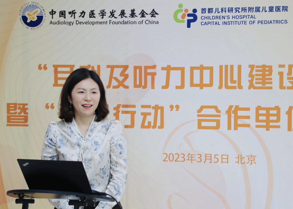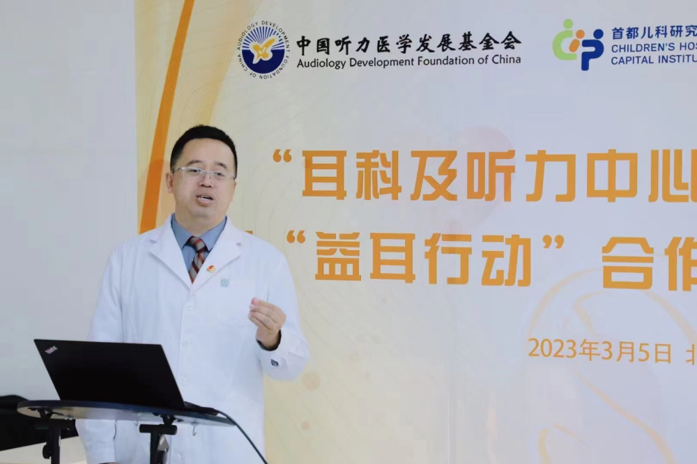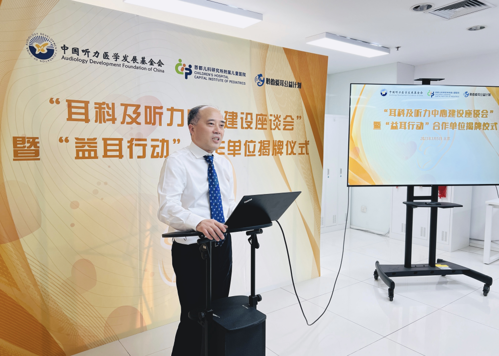 我会龚树生理事长致词,他说开展学术交流活动,为大家提供有利的学习机会,希望中国听力医学发展基金会与首都儿科研究所附属儿童医院共同努力,在举办活动的过程中更加紧密、深入的交流,让更多听障人群回归有声世界。龚理事长介绍了基金会的发展历程和近年来开展的主要工作,期待以 “益耳行动”揭牌为契机,双方开展更广泛,更深入的合作,为公众提供更高质量的听力健康服务。