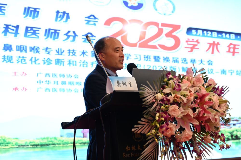 我会理事长龚树生教授和《中华耳鼻咽喉头颈外科杂志》编辑部房玉新主任分别致辞并预祝大会圆满成功,感谢国内众多一流专家及其团队在共同制定该指南和共识的过程中做出的努力与卓越贡献,该指南和共识的推出,为我国外耳道癌的规范化诊疗提供重要的指导意义,也将给广西外耳道癌患者带来了福音,改善其预后和生活质量。
