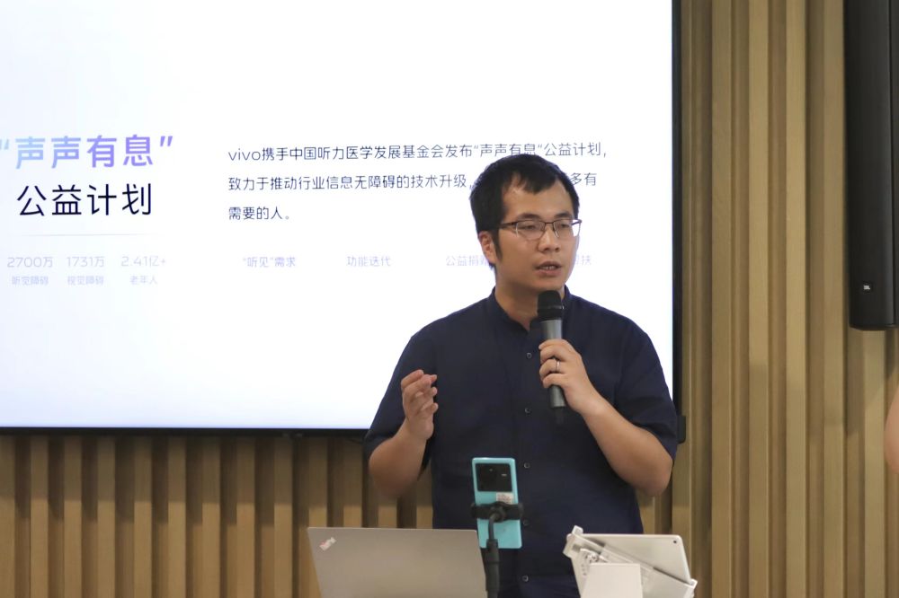 郑璇教授在工作坊现场以“有爱无碍”为主题做了分享,讲述了科技如何助力听障者冲破无声世界。vivo AI解决方案中心总监谢伟钦在工作坊中为大家介绍了vivo无障碍产品发展历史,并对现场用户期待的无障碍功能的研发进度和时间表做了反馈。