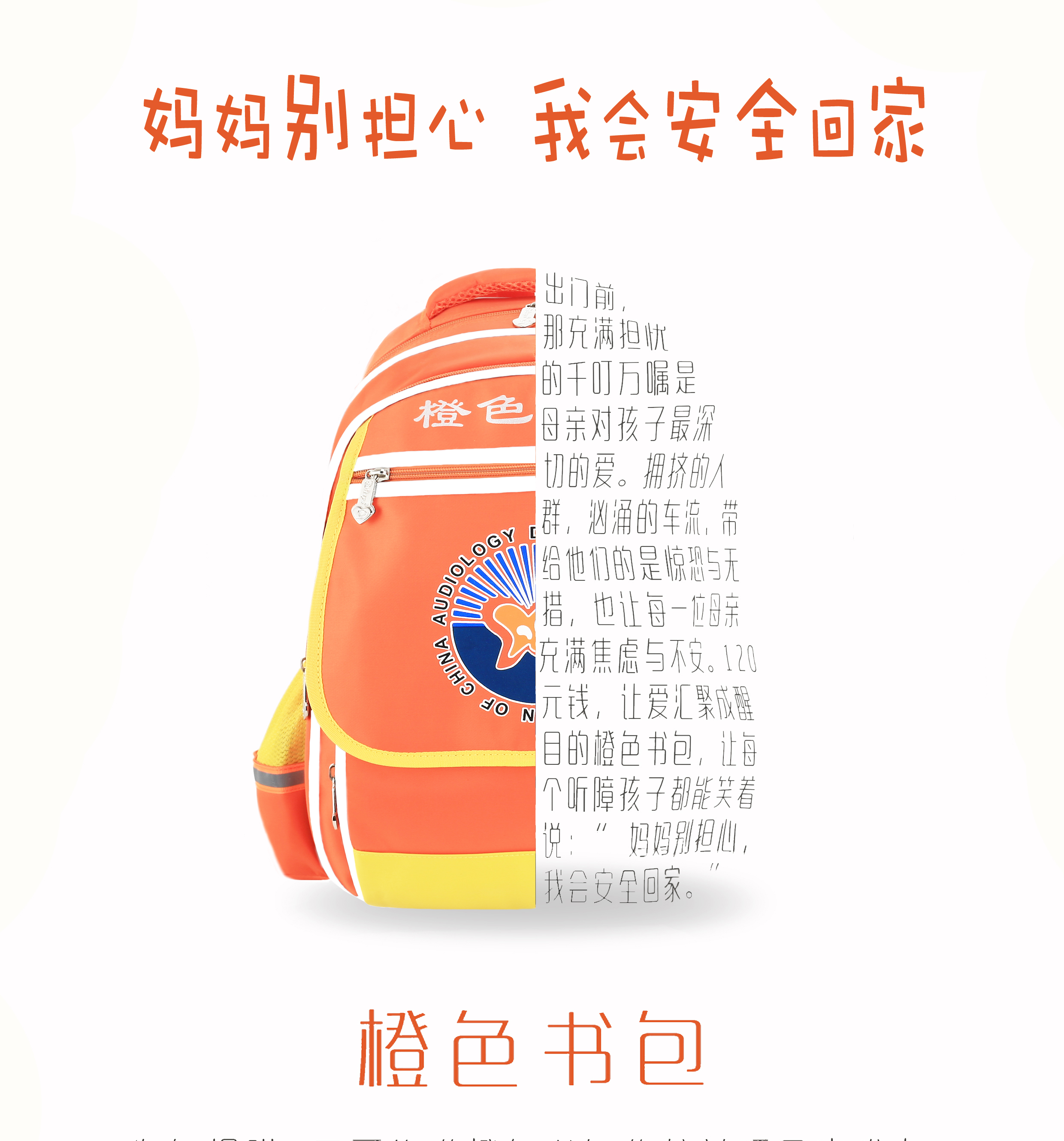 这个项目旨在为适龄听障儿童捐赠带有特殊标识的橙色书包,引发大众对听障儿童交通安全的关注,保护他们出行安全,为他们提供一个交通安全“护身符”,在全社会营造对弱势人群、残障人群的关爱文化。