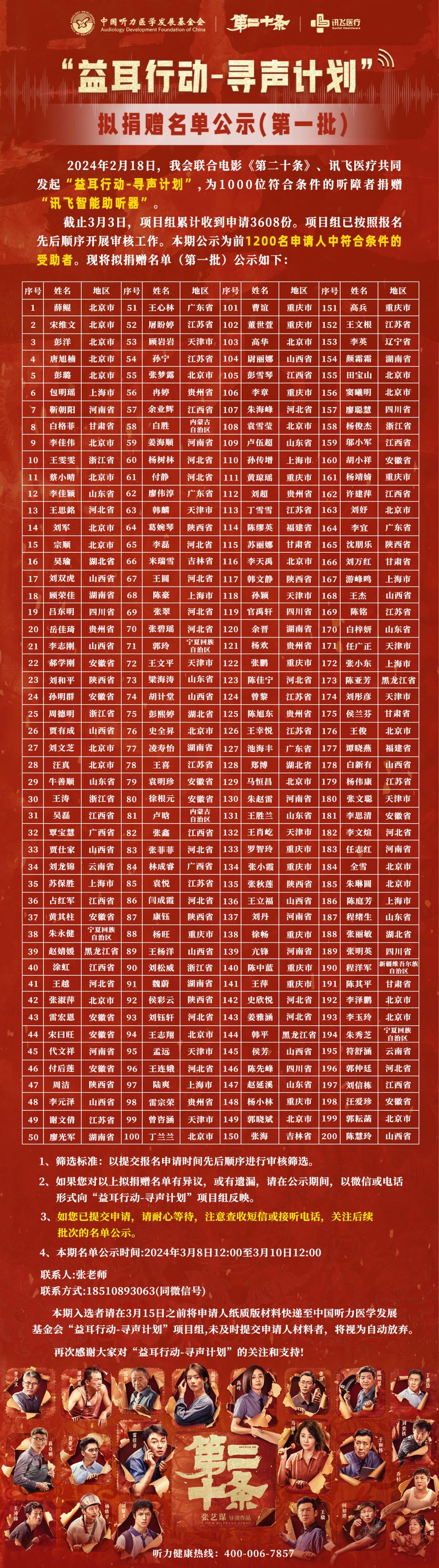 2024年2月18日,我会联合电影《第二十条》、讯飞医疗共同发起“益耳行动-寻声计划”,为1000位符合条件的听障者捐赠“讯飞智能助听器”。截止3月3日,项目组累计收到申请3608份。项目组已按照报名先后顺序开展审核工作。本期公示为前1200名申请人中符合条件的受助者。现将拟捐赠名单(第一批)公示如下: