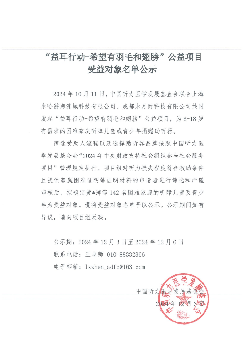 “益耳行动-希望有羽毛和翅膀”公益项目受益对象名单公示