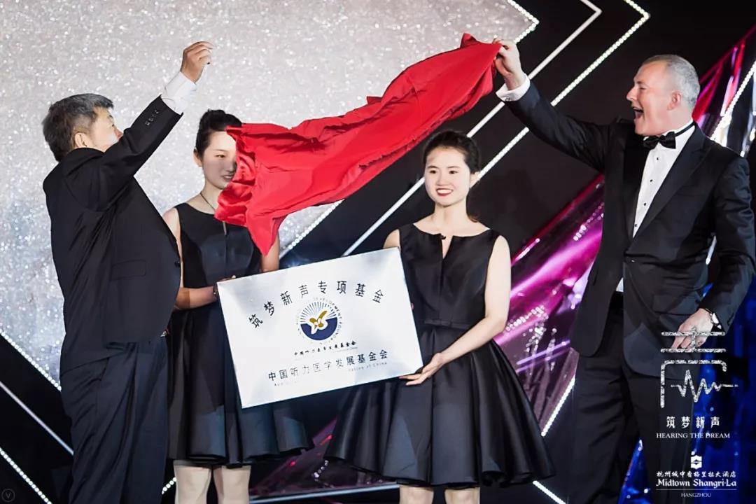 晚宴上我会监事长张元禄和杭州城中香格里拉大酒店总经理韦伯翰一同揭牌宣布:“中国听力医学发展基金会筑梦新声专项基金”(以下简称“筑梦新声”)正式成立。该基金由我会联合杭州城中香格里拉大酒店共同设立,用于资助0-6岁重度听障儿童的人工耳蜗植入及康复。