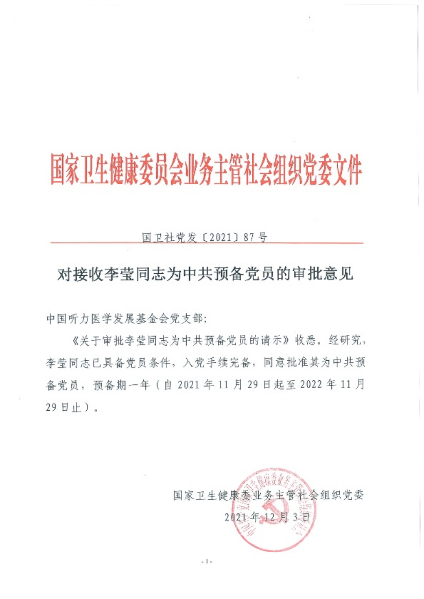11月29日上午,中国听力医学发展基金会党支部召开党员大会,主要讨论“接收李莹同志为预备党员”事宜。大会由党支部书记公泽忠同志主持,支部全体党员参加会议。